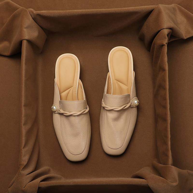 香港真皮包头女士夏季外穿半拖鞋2025新款尖趾厚高跟平底鞋拖鞋
