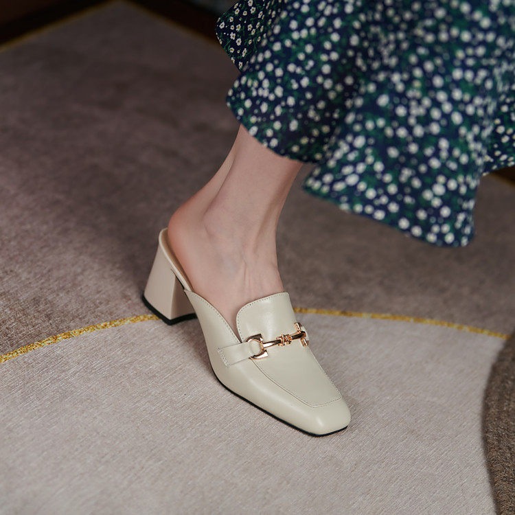 韩式真皮包头拖鞋女粗跟外穿防滑懒人穆勒鞋时尚半拖鞋米白色金属