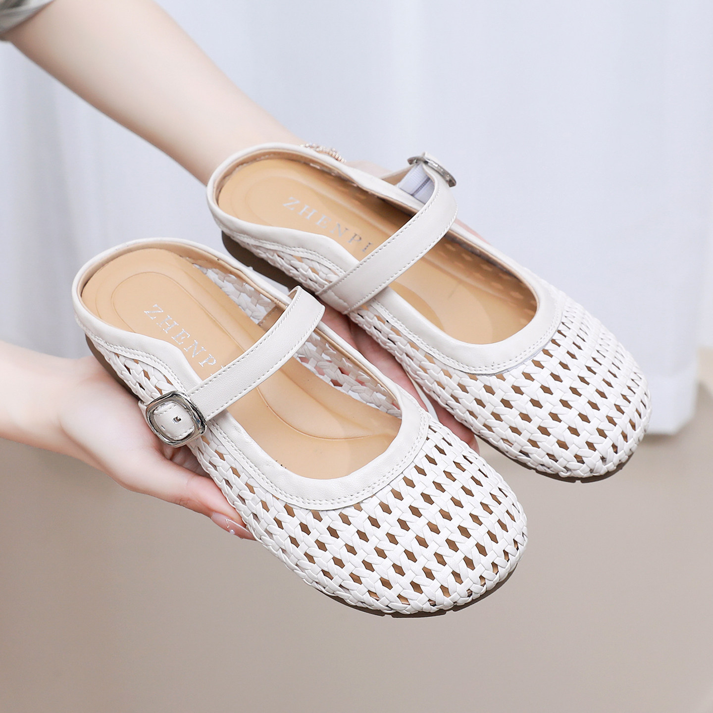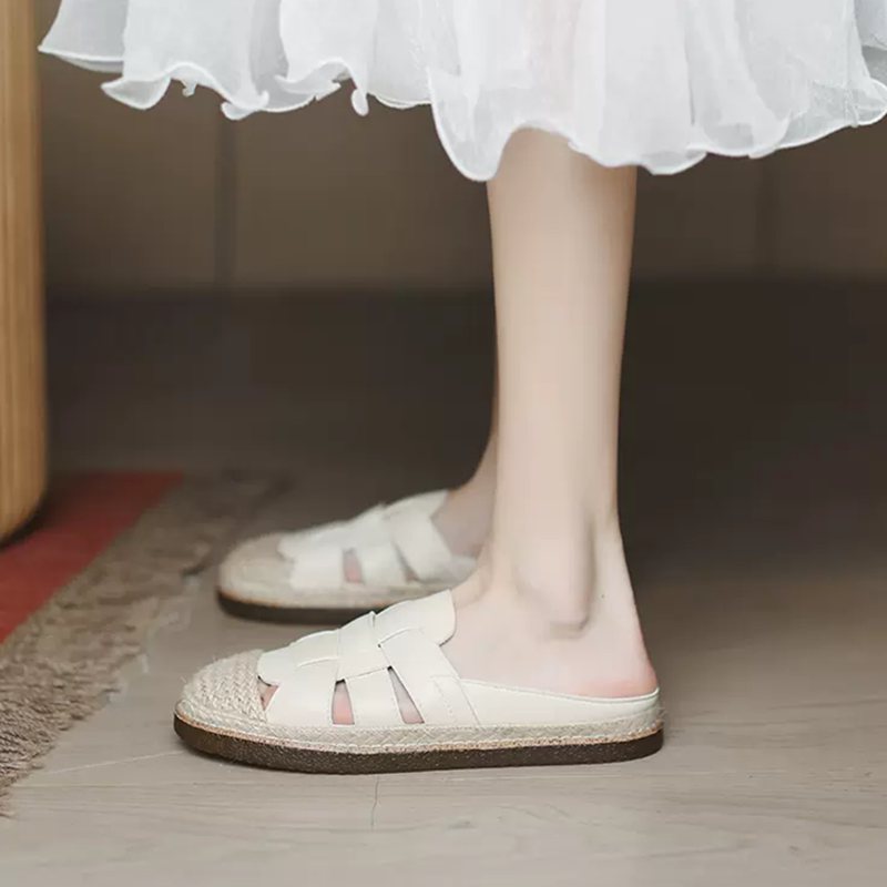 真皮包头半拖鞋2026夏季休闲镂空玛丽珍女鞋大码平底懒人编织凉拖