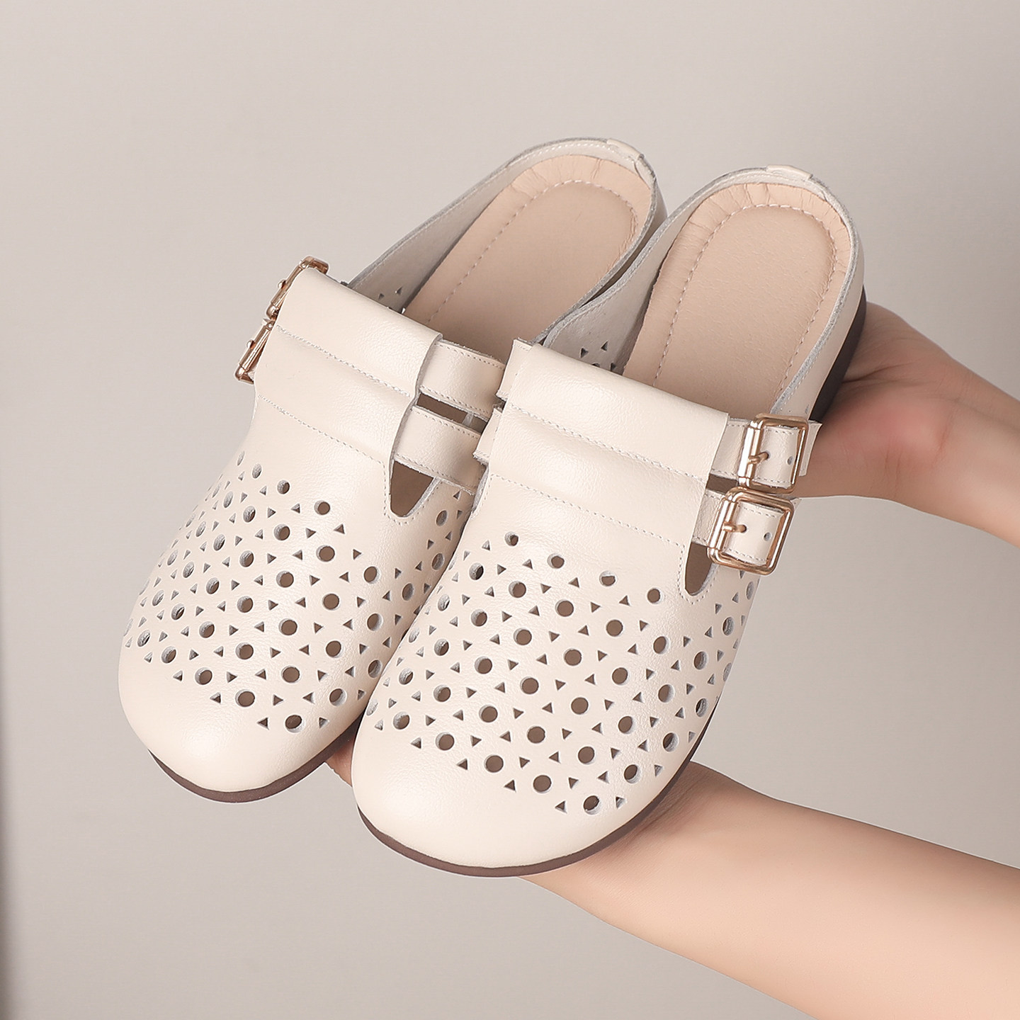 真皮包头半拖鞋女夏季外穿一脚蹬洞洞凉拖鞋软底镂空透气妈妈鞋子