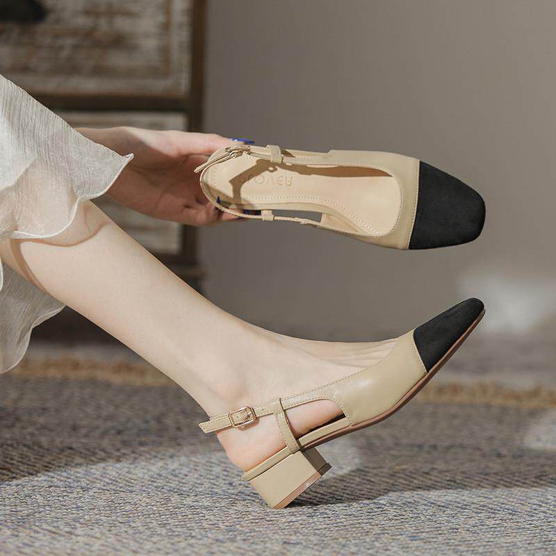 店主自留新款~真皮包头低跟粗跟凉鞋女2025夏季方头后空中跟单鞋