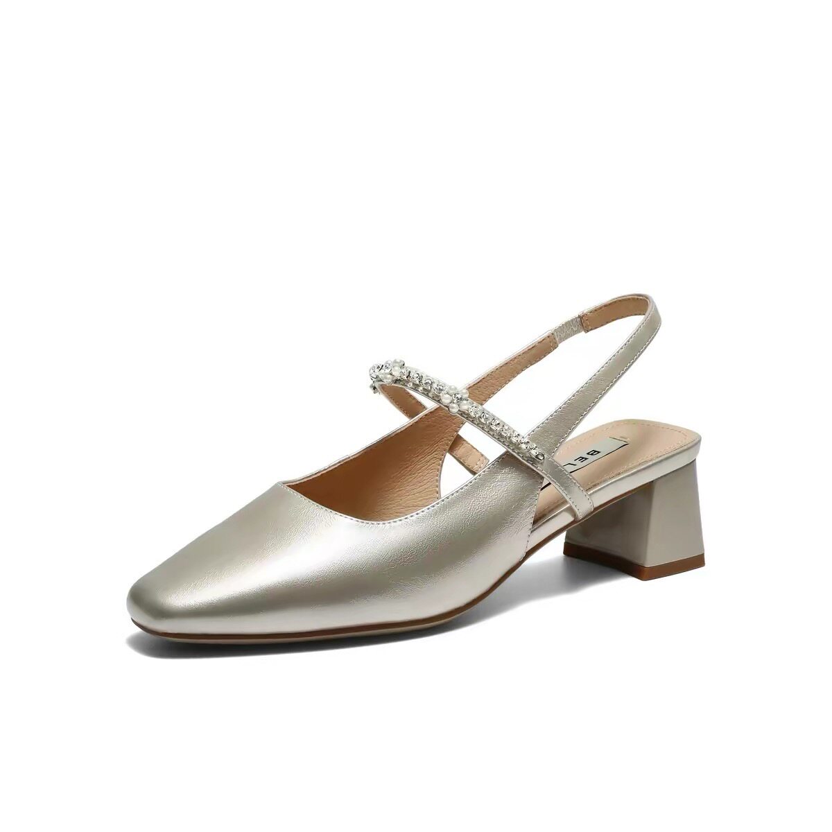 羊皮版!法式仙女风方头高跟鞋女优雅水钻粗跟单鞋真皮包头凉鞋