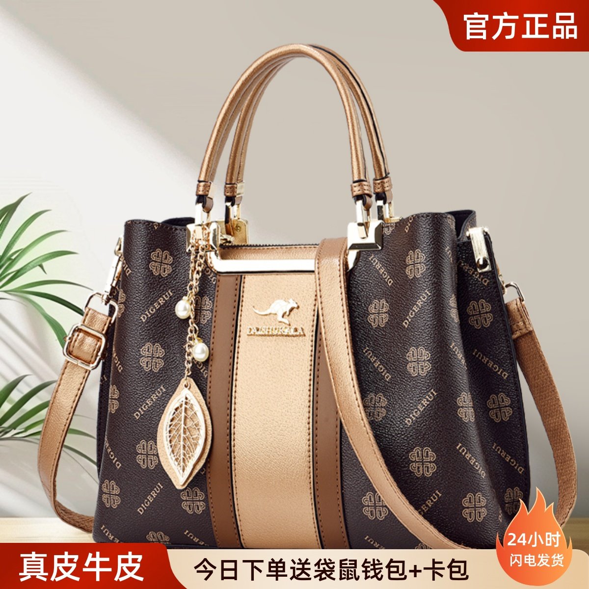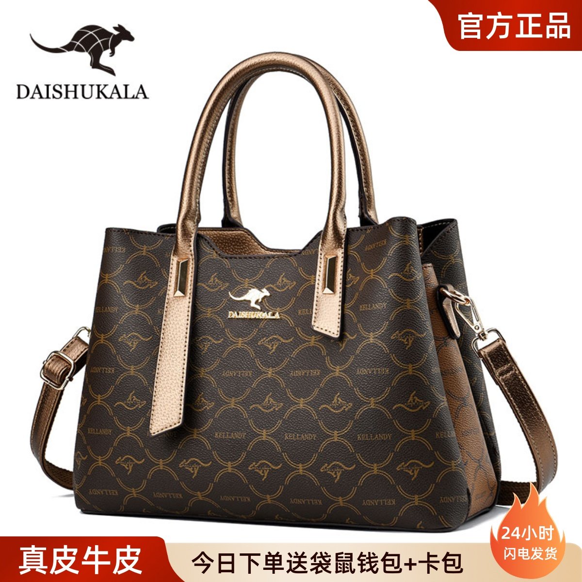 袋鼠真皮手提包女士包包高级感时尚2025新款大气中年妈妈包牛皮包