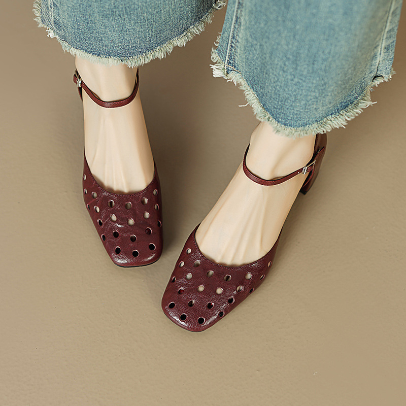 镂空真皮包头凉鞋女2025夏季新款粗跟中空单鞋配裙子高跟鞋洞洞