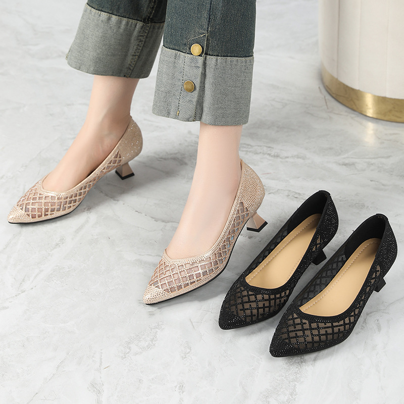 粗跟时尚凉鞋女夏真皮包头镂空透气网纱中跟妈妈单鞋大码女鞋