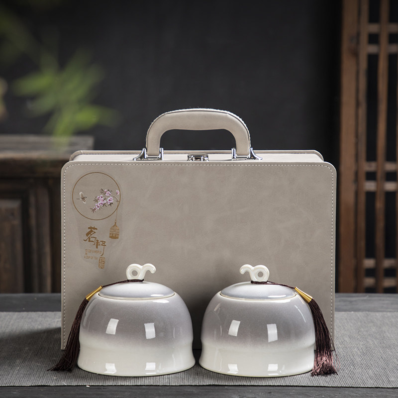 新款高档中式红茶普洱中号陶瓷茶叶罐礼品盒茶叶包装礼盒皮包双罐