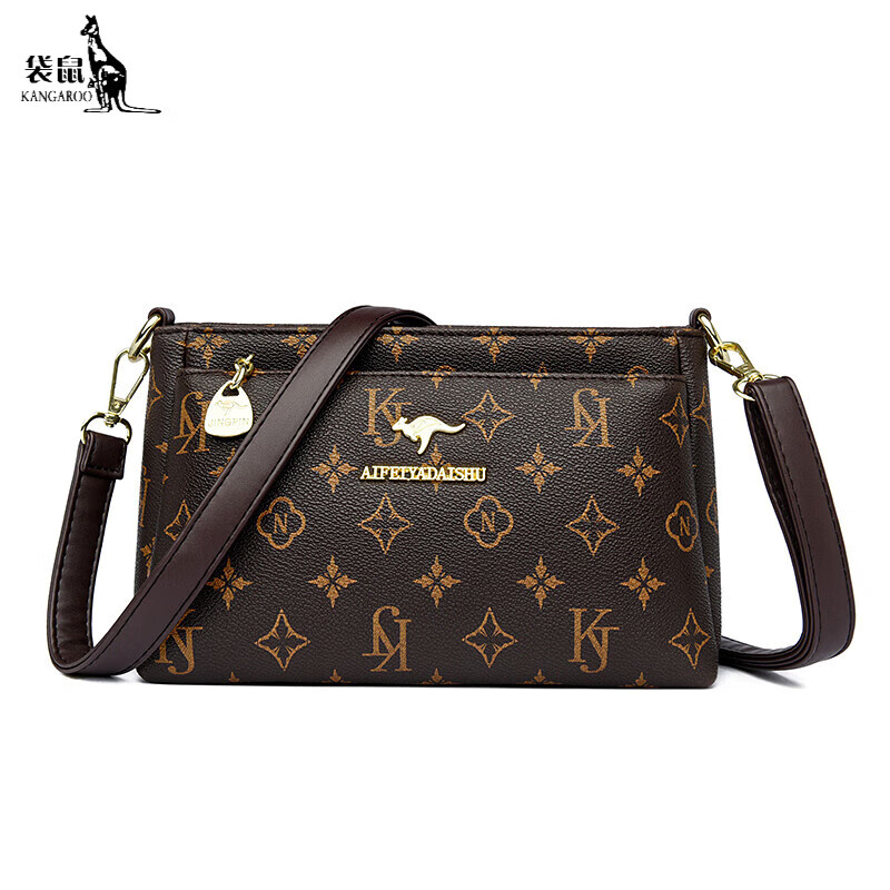 袋鼠中年妈妈包2024印花真皮女包软皮包包多层休闲女士单肩斜挎包 KJ棕