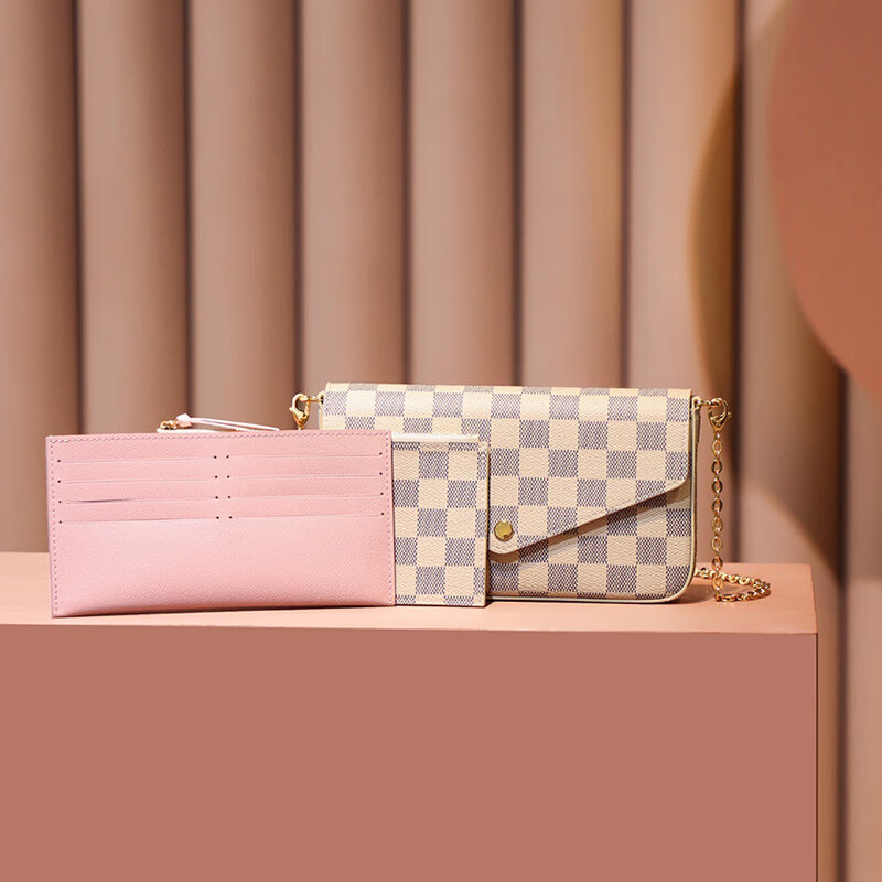 香港正品2025新款女包代购中古包真皮包链条斜挎小方包老花信封包 白格配粉色