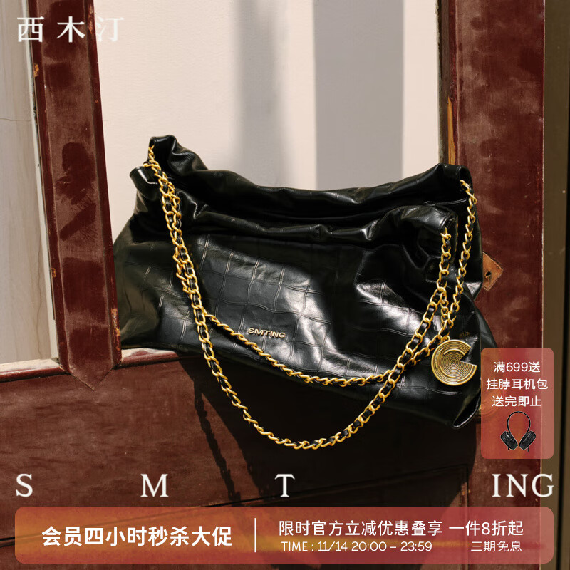 西木汀 程梓同款 悠途 头层牛皮包包新款女托特包小大容量链条包包 深邃黑