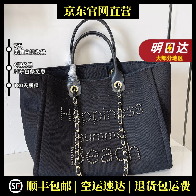 MOOLENA轻奢品牌真皮包包女包小香风帆布包珍珠刺绣沙滩包单肩包链条牛皮 黑色
