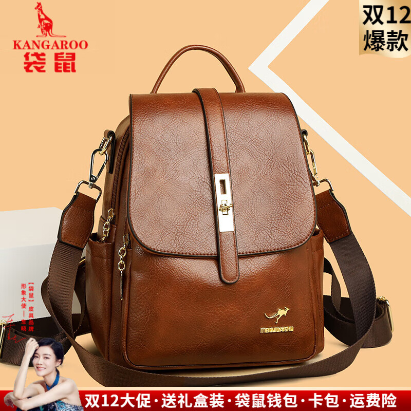 袋鼠2025新款韩国潮女士背包软皮包大容量真皮单肩双肩包两用包女