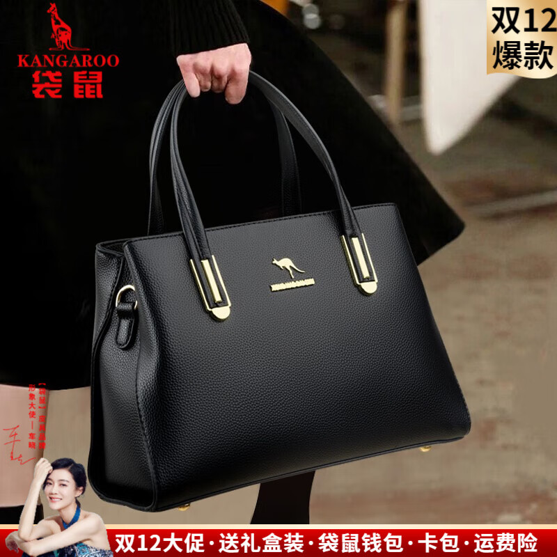 袋鼠品牌中年妈妈手提包真皮包包女包2025新款时尚牛皮斜挎包红色婚包 黑色(礼盒+手包卡包)