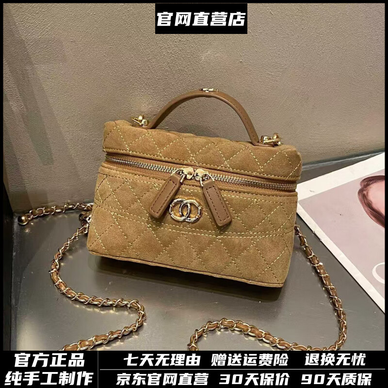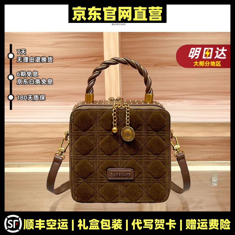 柏欧迪芬奈丝轻奢品牌真皮包包女包丝绒菱格香水包小众手提包单肩包款 咖色【精美礼盒+礼袋】