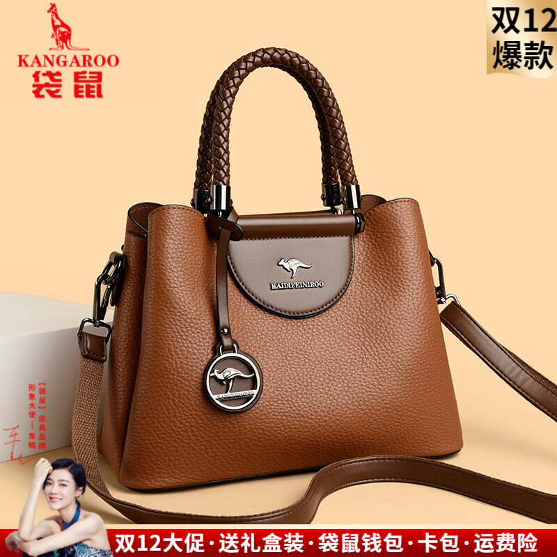 萱羽袋鼠女包2025新款中年手提包真皮包包女妈妈包百搭牛皮斜挎包