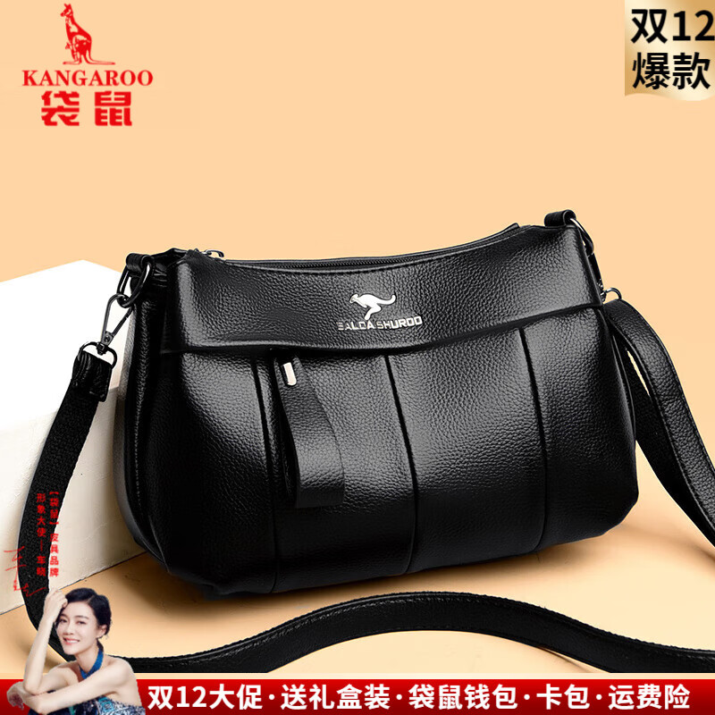 袋鼠真皮包包女包多层2025七夕中年妈妈简约百搭软皮单肩斜挎小包 黑色