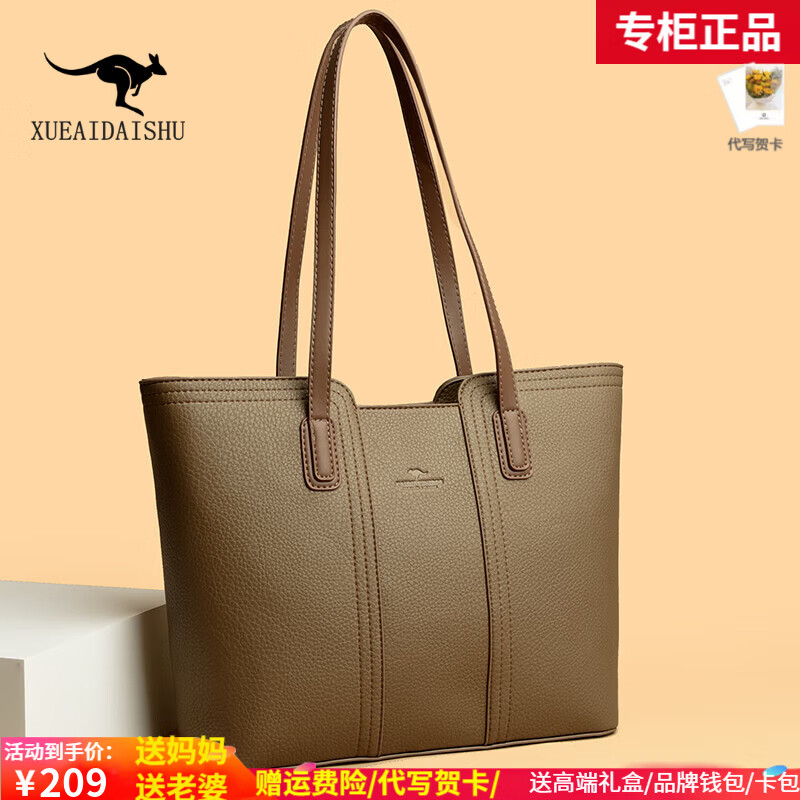 雪爱袋鼠牛皮包包女包情人节托特包单肩包手提母亲节生日礼物送妈妈送老婆 卡其配卡其[礼盒装+手包卡包]