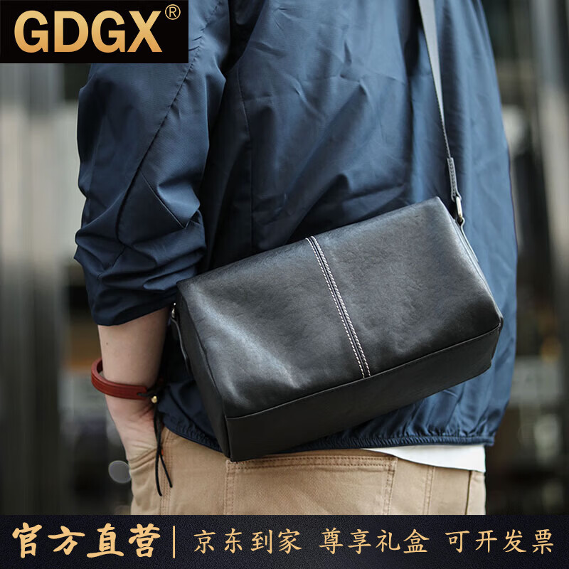 GDGX男士斜挎包真皮单肩包植鞣头层牛皮高级感枕头包通勤皮包背包男包 黑色 25.5*10.5*13.5cm