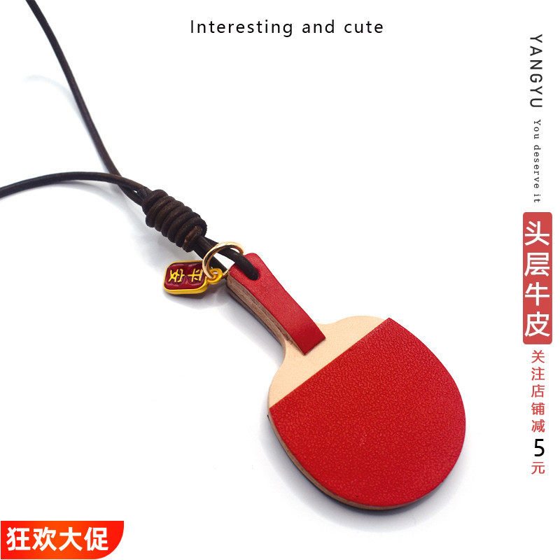 真皮『乒乓球拍』同款双面手工牛皮包挂件钥匙扣车内挂饰手账书签