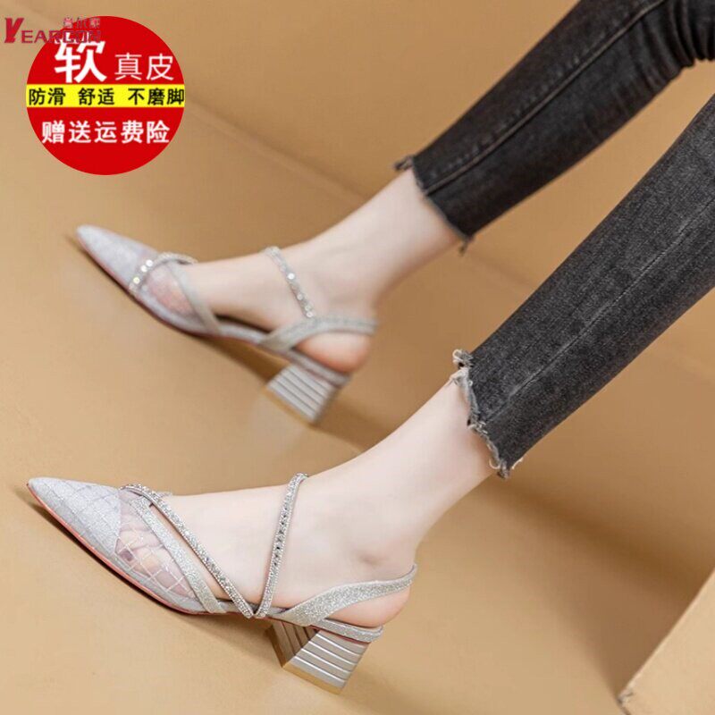 意尔康真皮包头一字带凉鞋女2026夏新款网纱粗跟水钻高跟尖头女鞋