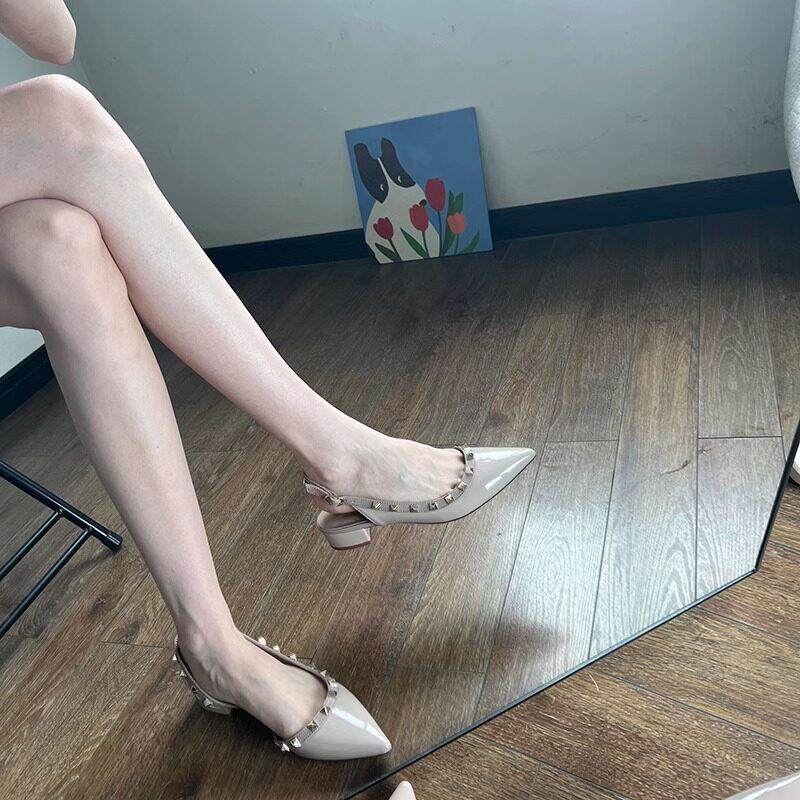 香港真皮包头凉鞋女夏季2025新款平底铆钉漆皮粗低跟浅口尖头包鞋