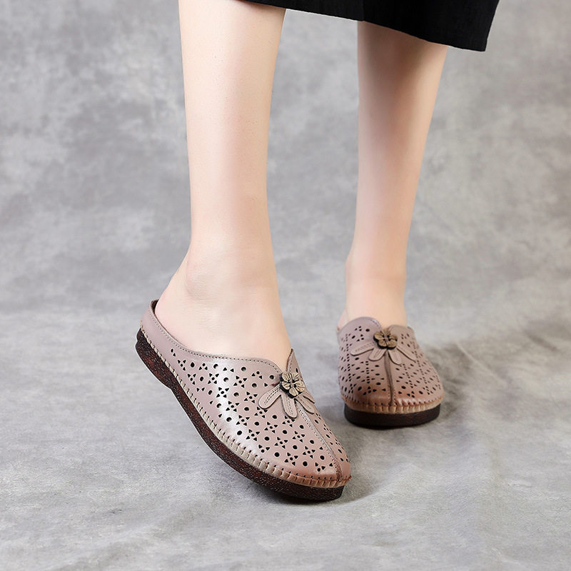 真皮包头女士拖鞋夏季头层牛皮外穿凉拖镂空雕花朵复古半托妈妈鞋