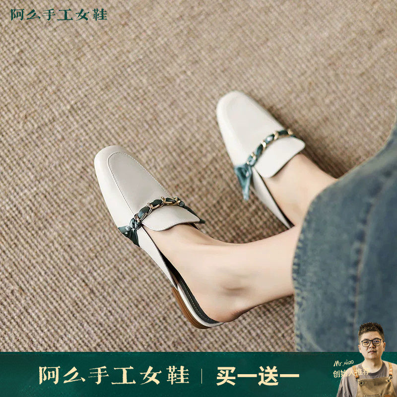 阿么手工女鞋夏季外穿百搭凉鞋低跟真皮包头半拖丝带穆勒鞋