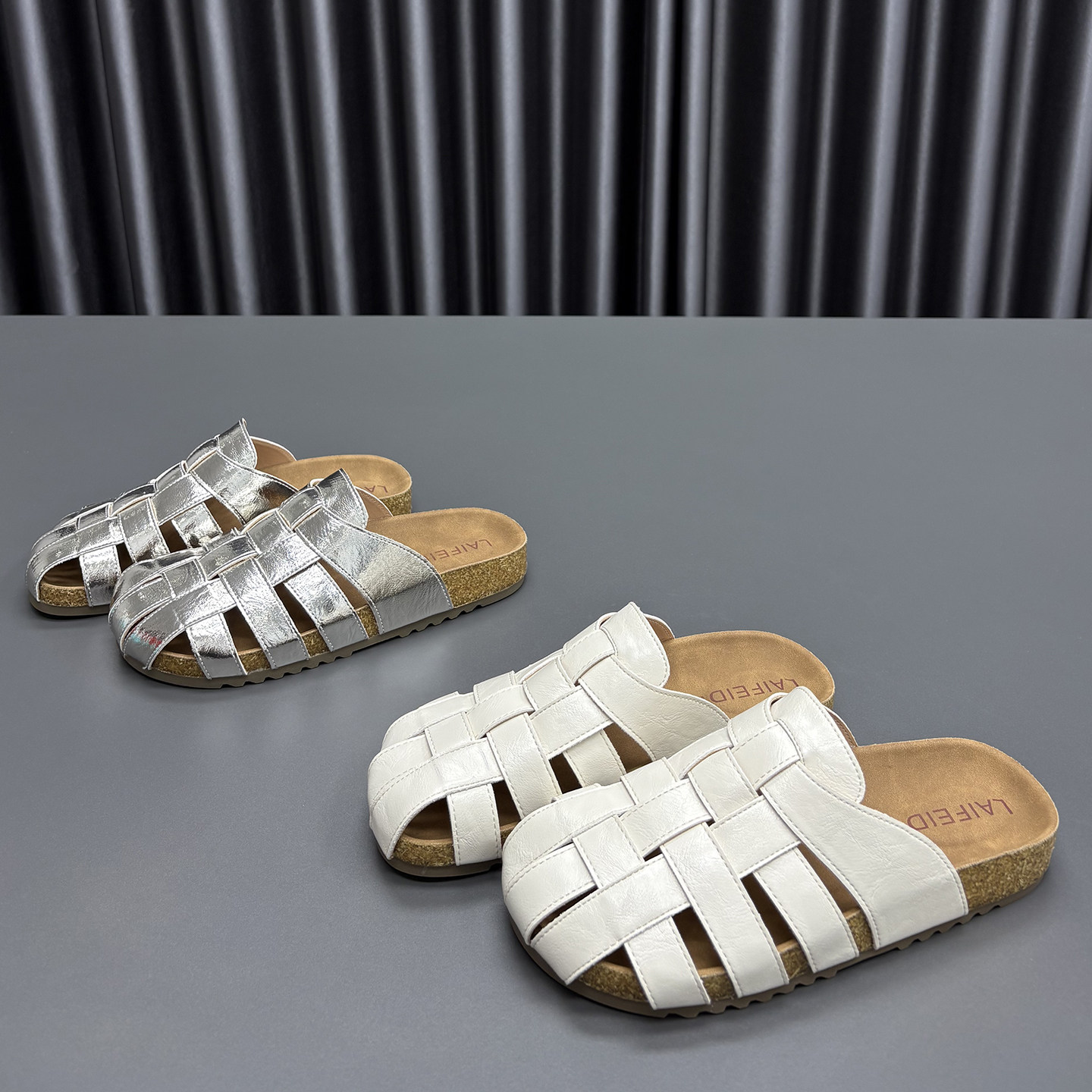 2026新品~真皮包头拖鞋女编织带夏季透气圆头一脚蹬外穿拖鞋米白