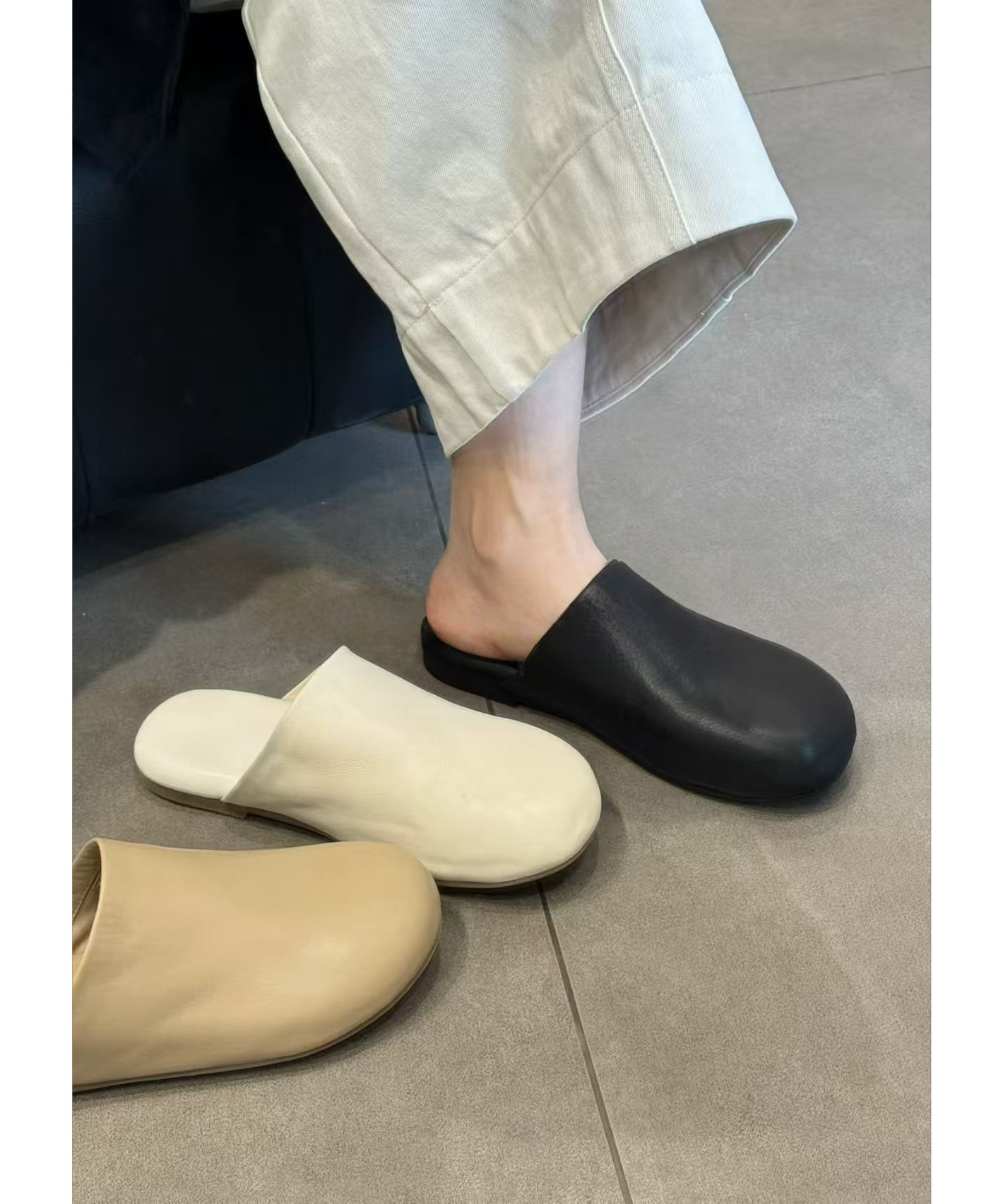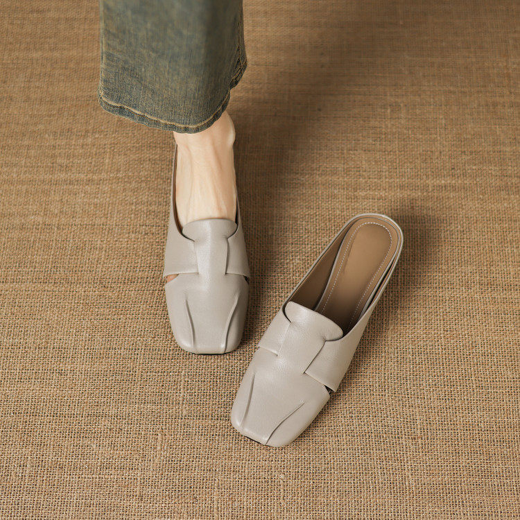 巨好穿~真皮包头半拖鞋女粗跟一脚蹬防滑百搭懒人穆勒鞋外穿灰色
