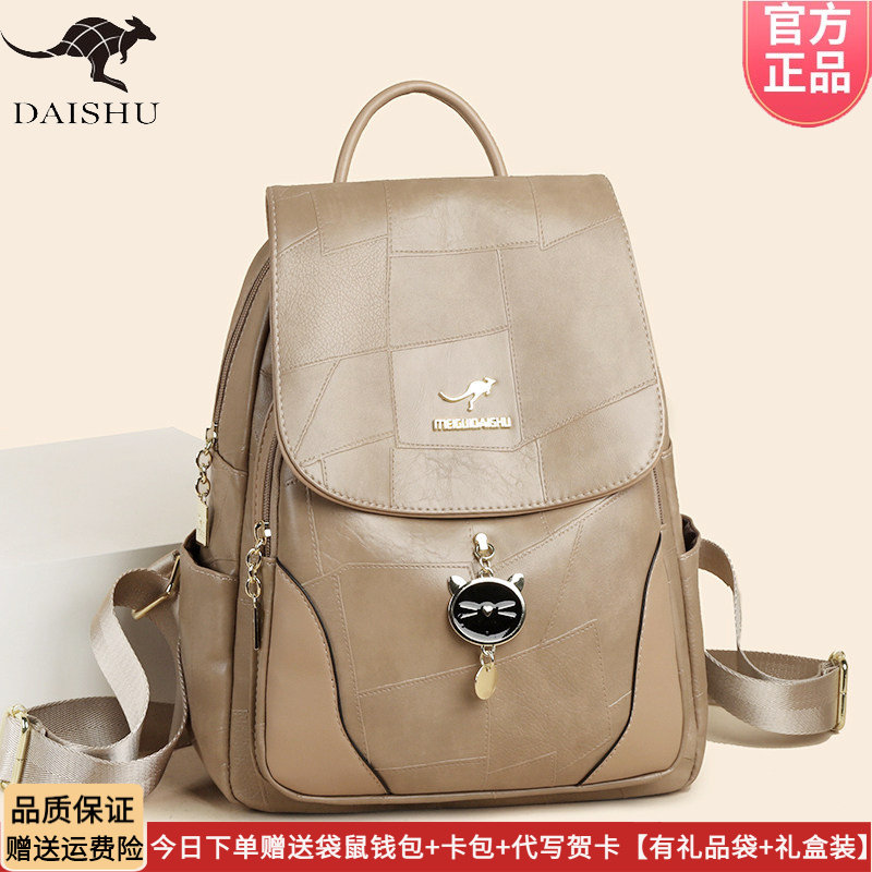 正品袋鼠皮包双肩包女2026新款时尚百搭大容量软皮包软皮女士背包
