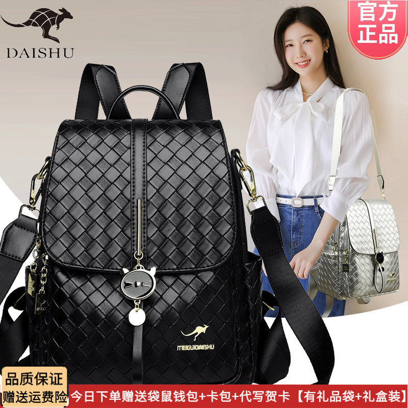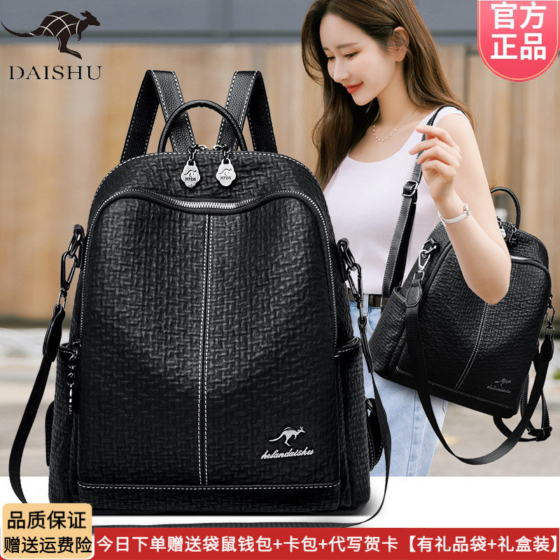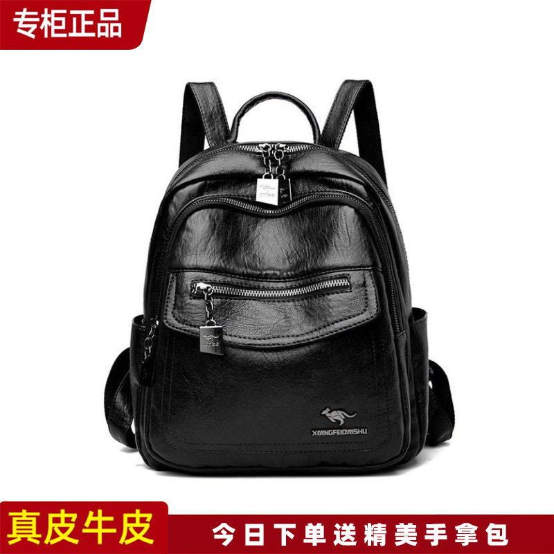正品袋鼠真皮双肩包女包包2024新款旅行背包大容量时尚百搭软皮包