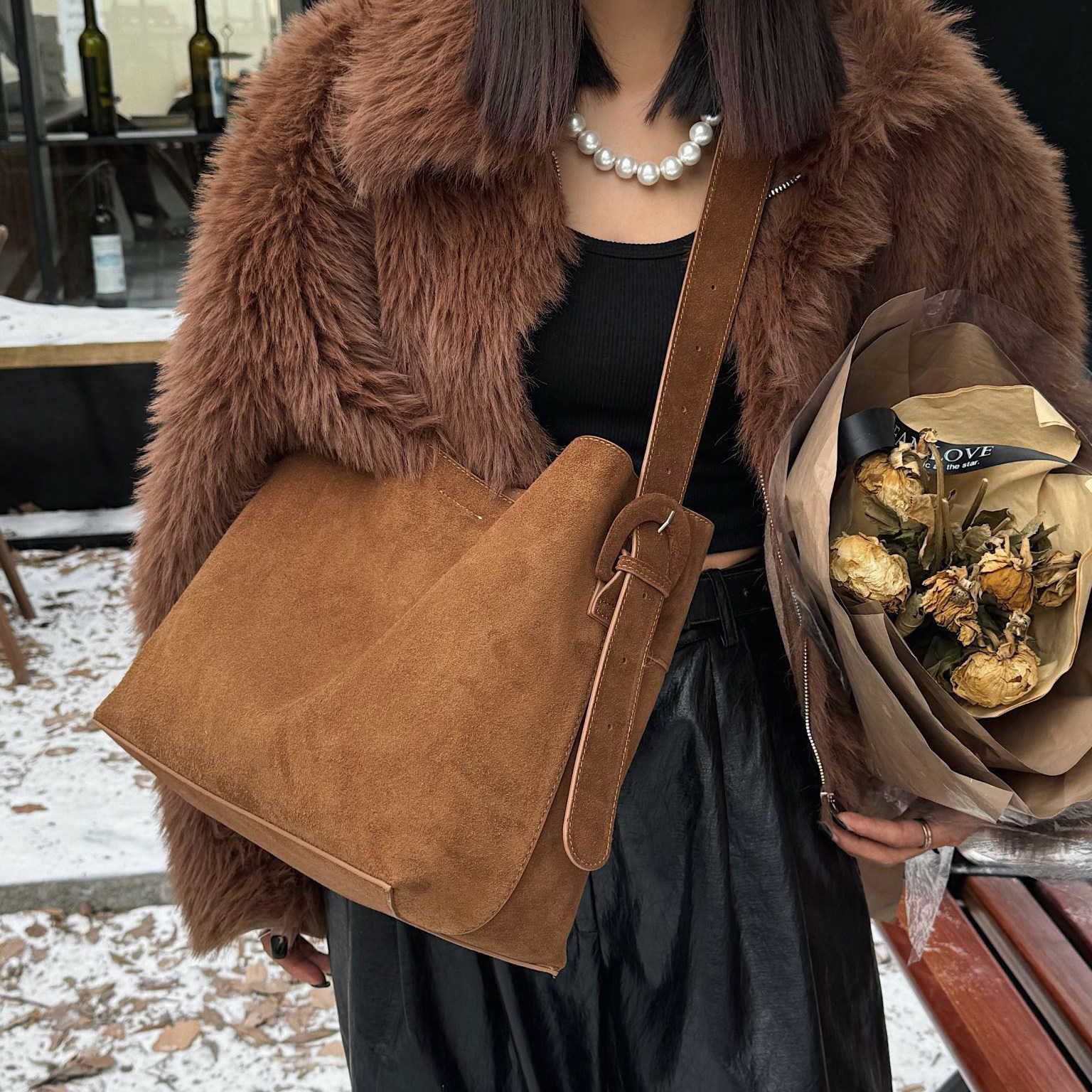 高级感黑色腋下包女2025新款百搭通勤大容量托特包麂皮包磨砂包包