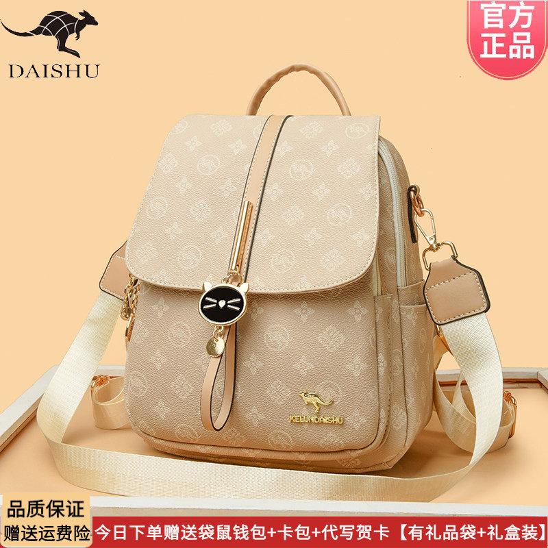 正品袋鼠双肩包女皮包2026新款时尚旅游轻便背包妈妈款大容量软皮