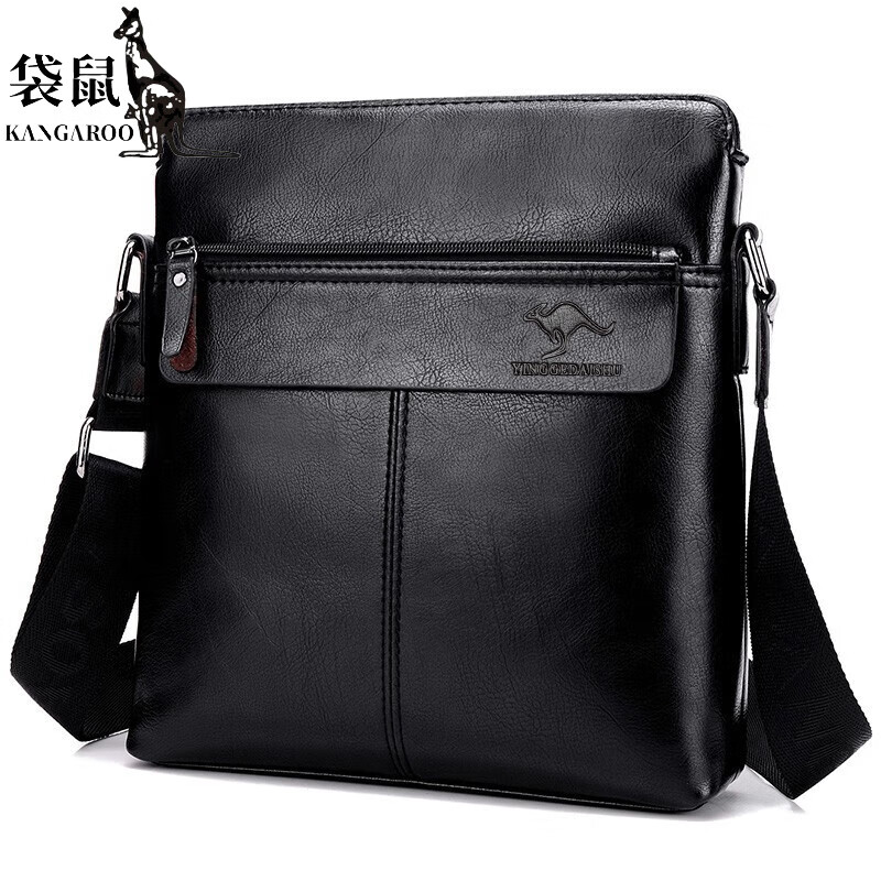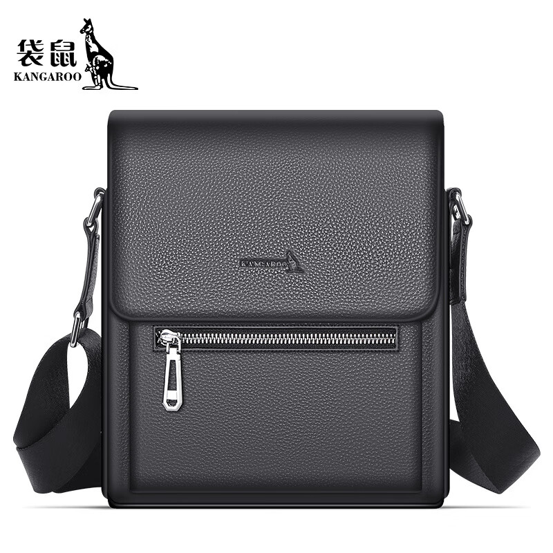 袋鼠男包单肩包2024新款竖款商务包软皮休闲背包皮包男士包包斜挎包 黑色