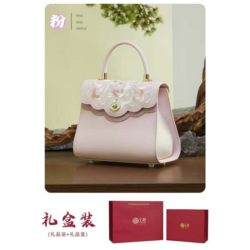 PmSix新中式国风真皮刺绣纽扣优雅单肩斜挎手提牛皮包包女士 粉色-礼盒装