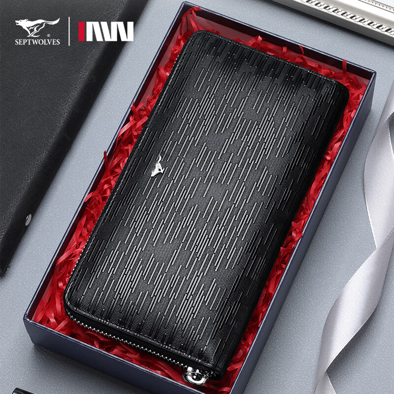 七匹狼(SEPTWOLVES)钱包男士长款新款真皮手包拉链皮夹爸爸皮包男款手拿包 新款拉链钱包(精美礼盒+代写贺卡