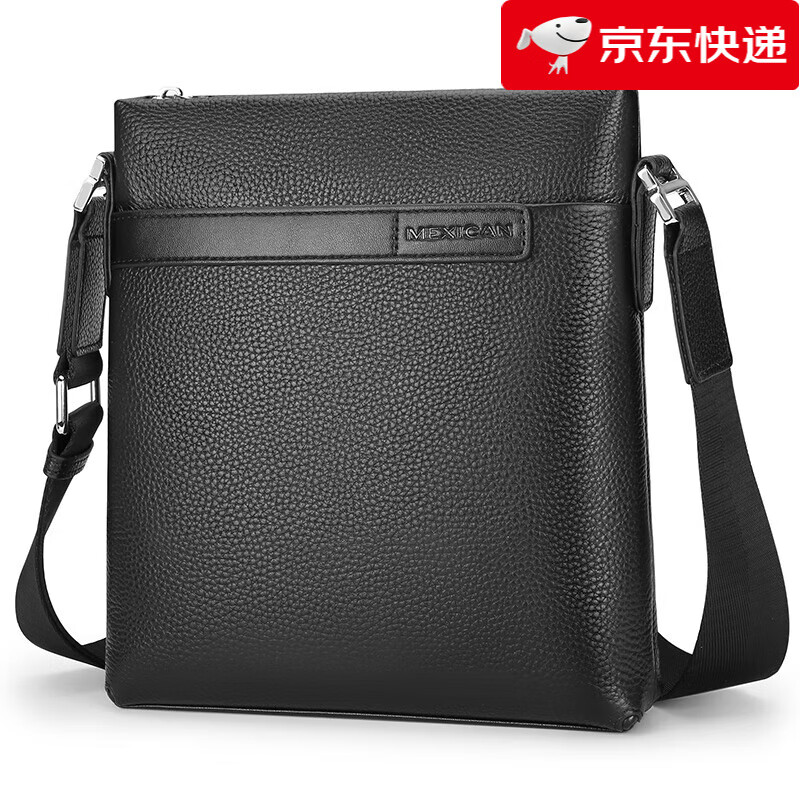 稻草人(MEXICAN)单肩包男斜挎包潮商务休闲真皮男士大容量拉链皮包挂包高级感 黑色