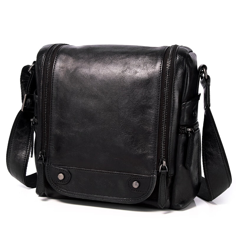 劳利斯登夏季复古包头层牛皮男士皮包男真皮男包斜挎包男单肩包男 黑色