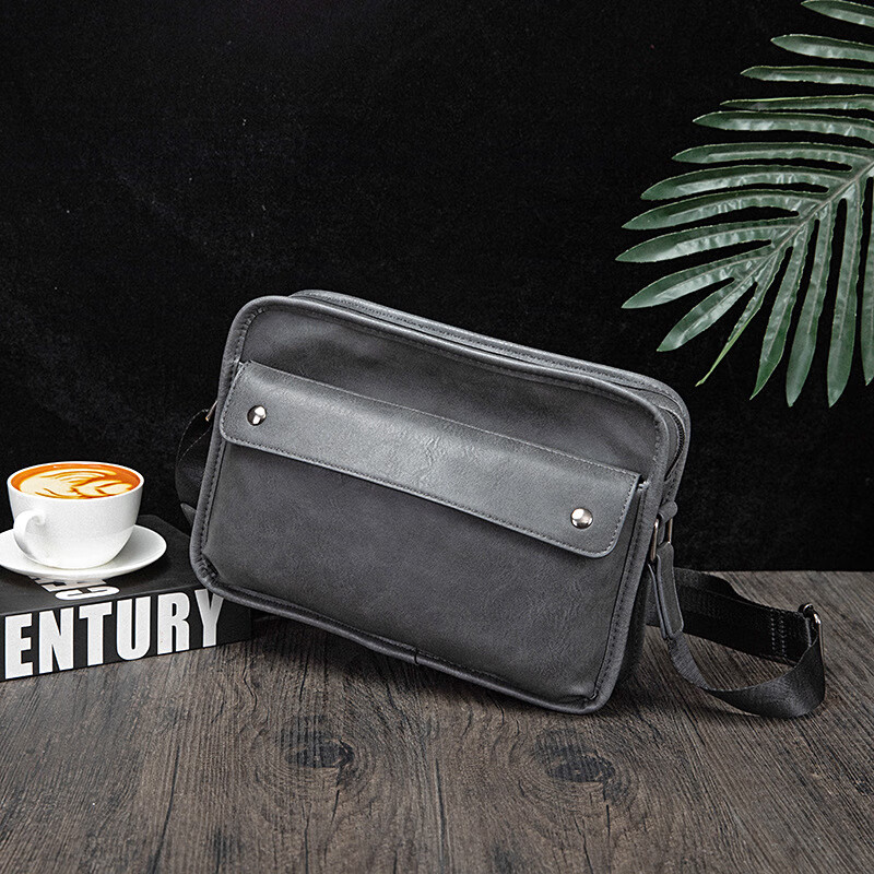 新款休闲复古斜挎包简约单肩包灰色PU皮质横款皮包潮流韩版男包 灰色