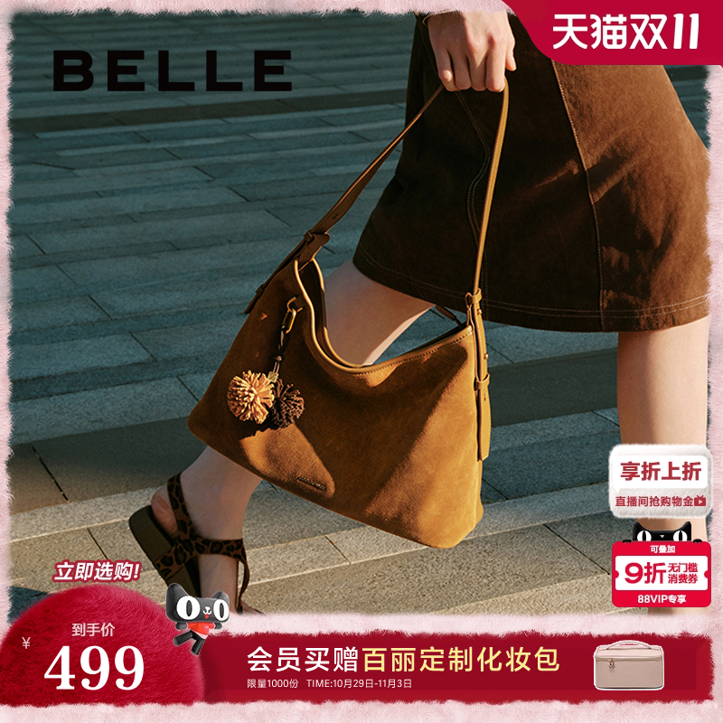 百丽反绒麂皮包包女2025新款hobo大容量单肩斜挎托特饺子包X7384