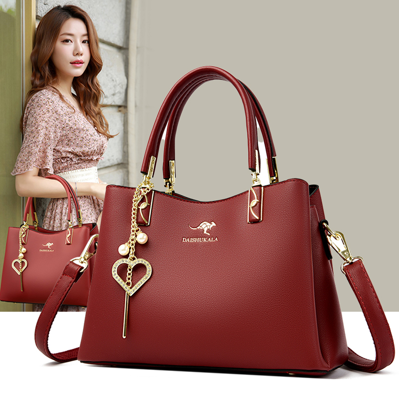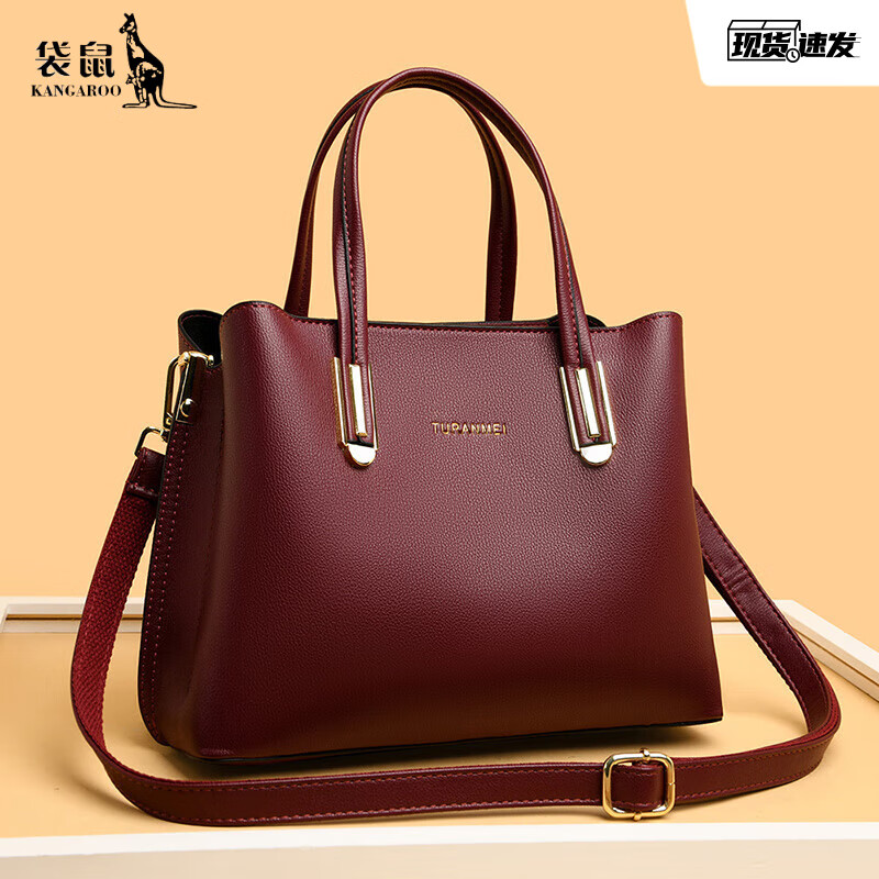 袋鼠真皮包包女2024七夕时尚斜挎手提包女两用包大气气质结婚包 酒红色