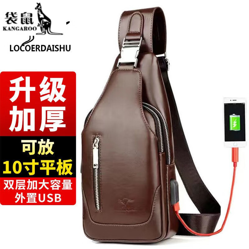 袋鼠款男士斜挎包高档帅气单肩多功能防水包出差软皮包大容量胸包 【升级-可充电】棕色防水包