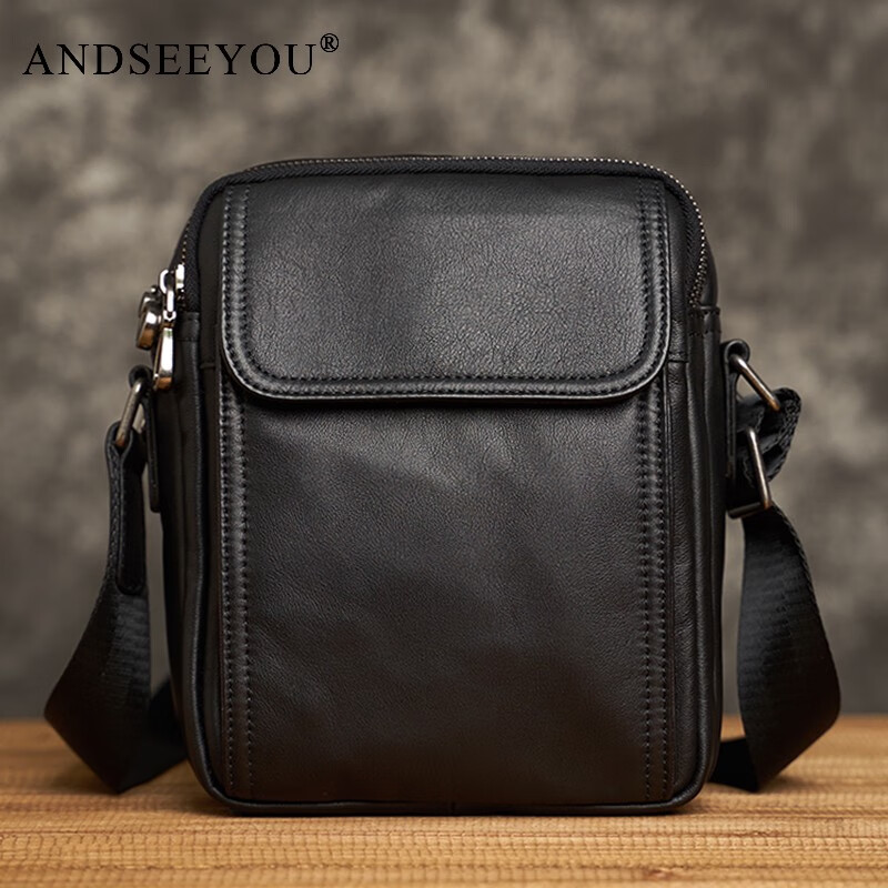 ANDSEEYOU新款男士单肩包真皮斜挎包头层牛皮休闲商务竖款青年牛皮包小背包 黑色