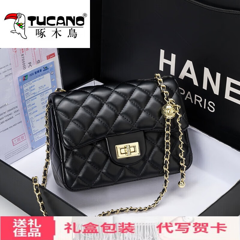 啄木鸟(TUCANO)品牌真皮包包女包小香风软皮时尚方胖子菱格链条斜挎包女生日礼物 送女友老婆礼盒装】黑色