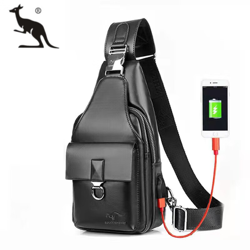 酷奇袋鼠男士胸包2025新款多功能男包真皮质感单肩斜挎包休闲皮包男小背包 黑色升级版