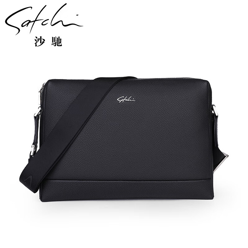 SATCHI沙驰男包单肩斜跨包男士真皮包包头层牛皮商务休闲大容量包正品新 黑色