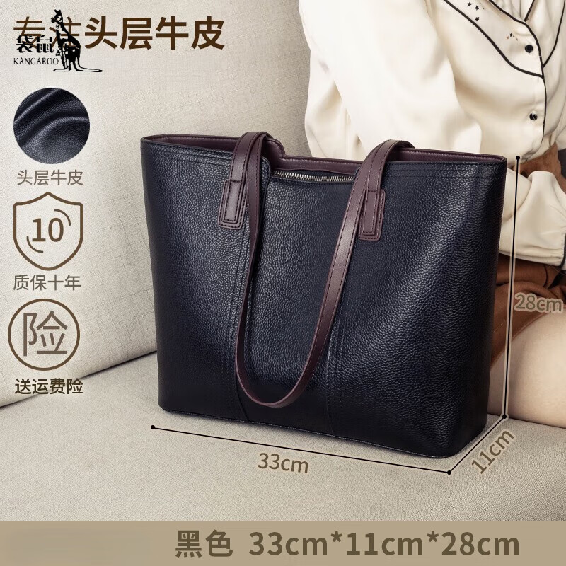 袋鼠真皮包包女士2025大容量托特包时尚高级感上班通勤手提包大包 黑色