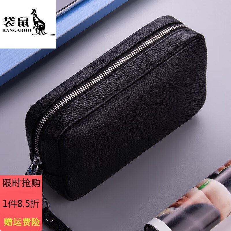 袋鼠(KANGAROO)真皮男士手拿包休闲手抓包男高级感商务手包大容量长款钱包软皮包 黑色21*11*6cm