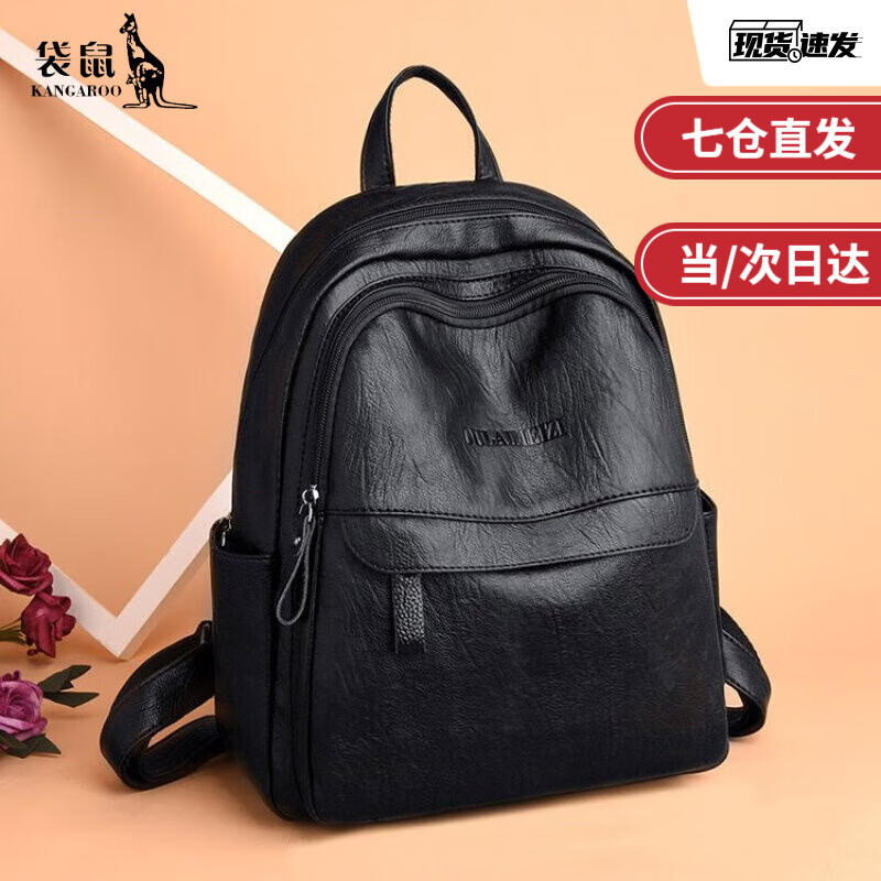 袋鼠羊皮双肩包女士2025七夕韩版百搭软皮包包简约大容量旅行真皮背包 黑色(当日发货)
