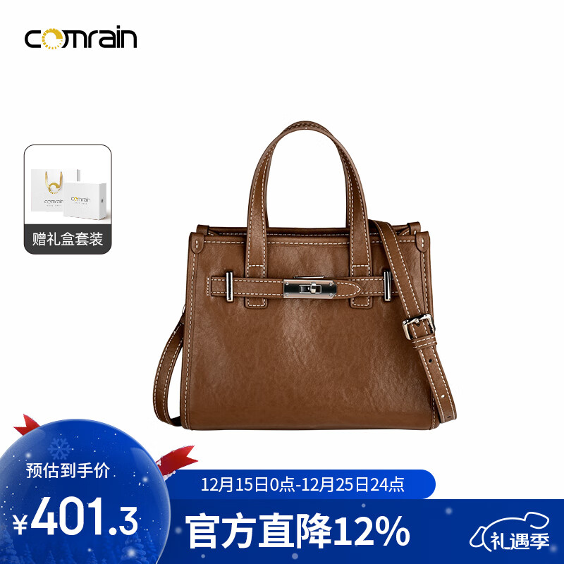 COMRAIN牛皮包包女款2025新款凯莉包女包通勤单肩斜挎包圣诞礼物咖色中号