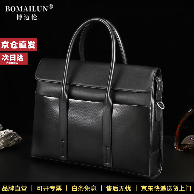 博迈伦男士手提包真皮商务公文包大容量通勤电脑包头层牛皮包出差斜挎包 黑色 37.5*7.5*28cm